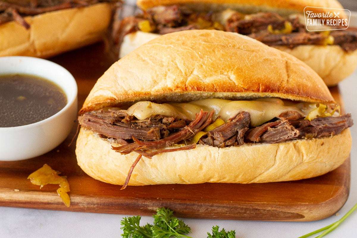 - Place pan under the broiler on high until cheese starts to melt. Remove pan from oven and line each sandwich with shredded beef, using a large fork or slotted spoon. Ladle additonal beef broth into a small cup to use as au jus for dipping.