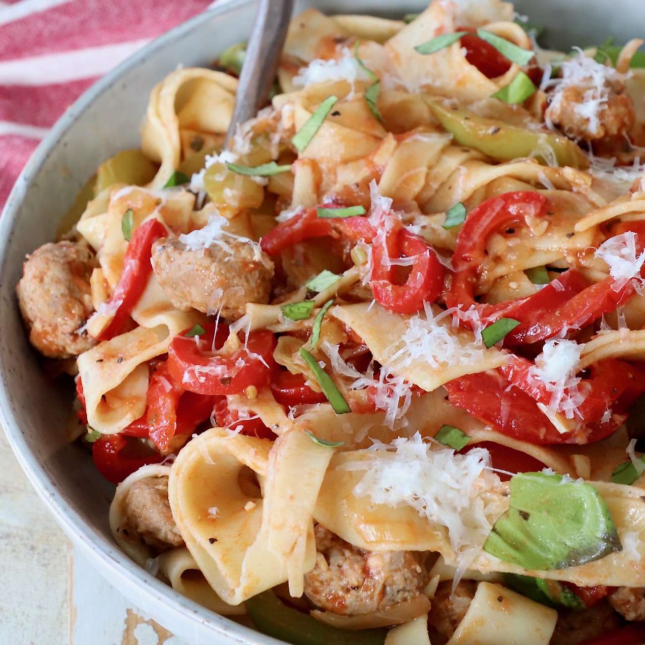 An Italian spin on an authentic Thai dish, Italian Drunken Noodles are made with wide egg noodles, tomato sauce, Italian sausage, fresh basil and peppers. This recipe is spicy, flavorful and easy to make in just 29 minutes!
