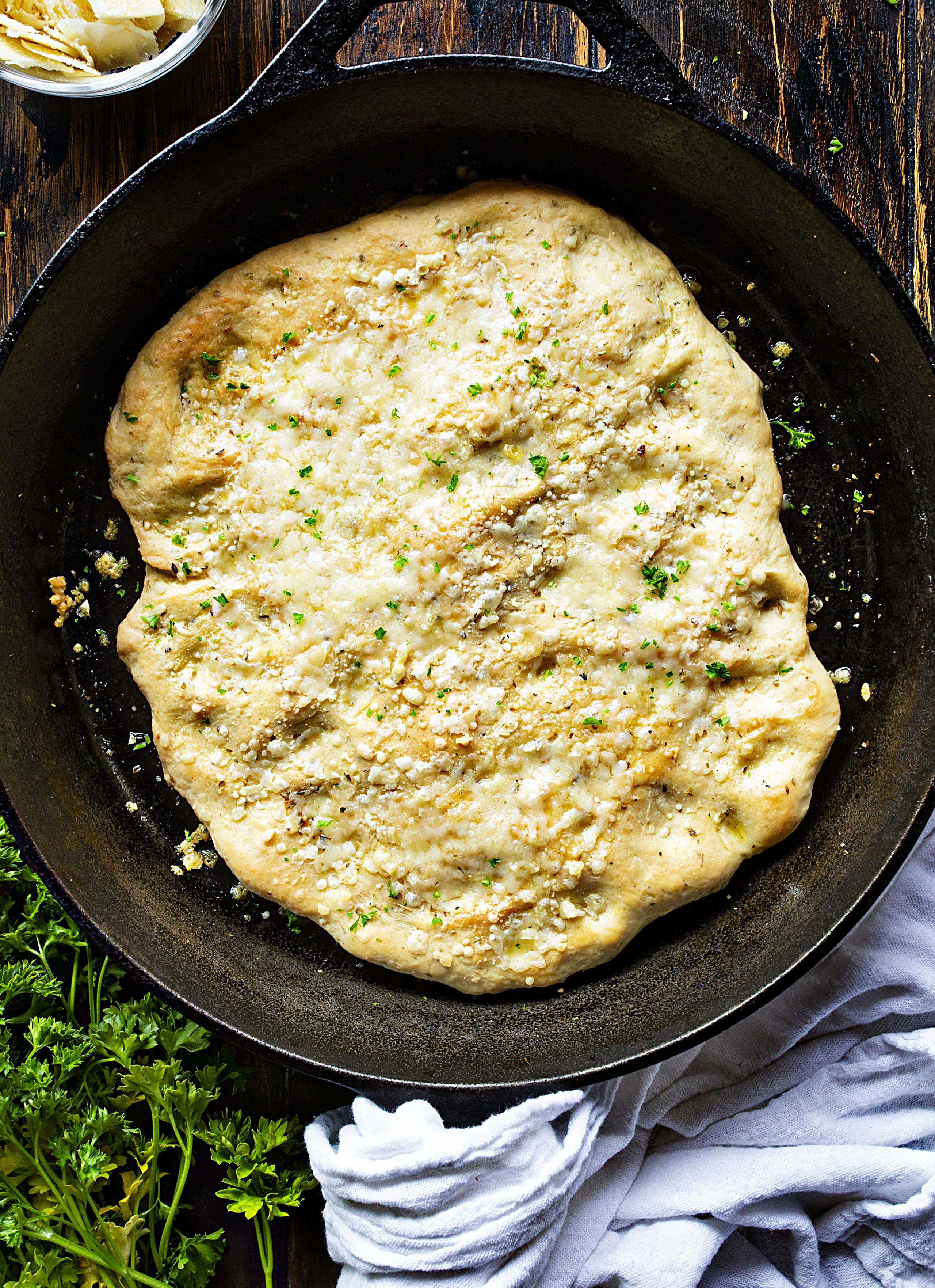 - Add the olive oil to a 12-inch skillet. Plop the dough into the oiled skillet and using your fingers, spread to a 1/2-inch thickness, making sure there are no holes. Season with, garlic salt, and remaining Italian seasoning.
