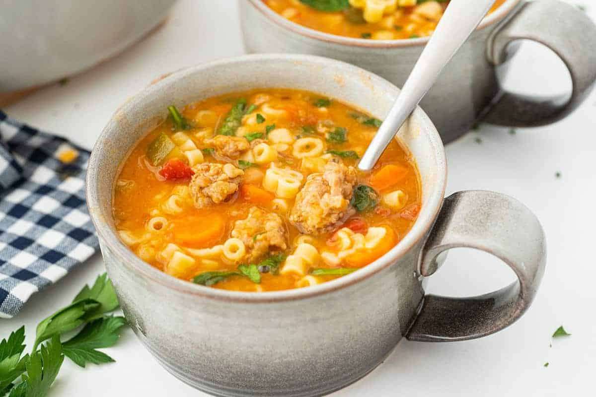 This hearty Italian sausage soup is loaded with protein, vegetables and pasta making it a complete meal in a soup bowl!