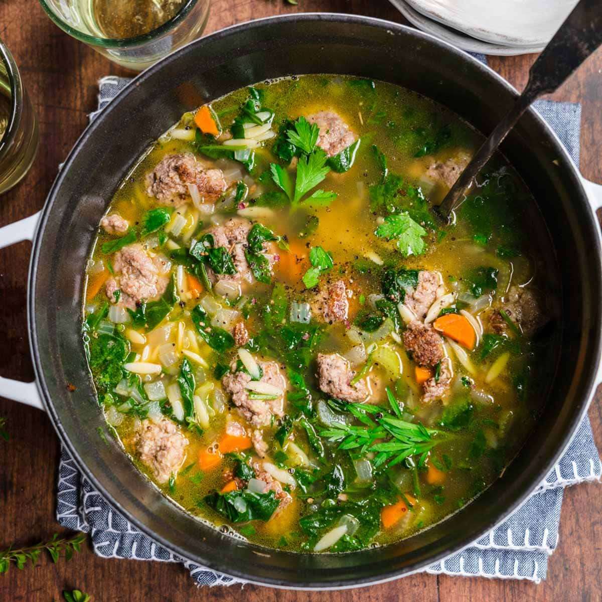 Italian Wedding Soup is a cozy soup recipe for fall! Classic soup with homemade meatballs, orzo pasta, and escarole in a savory broth.