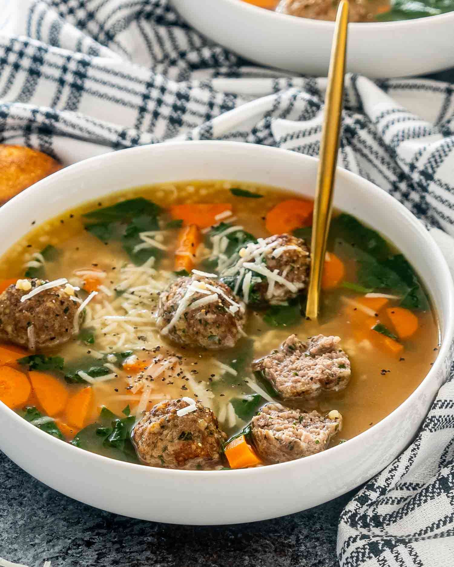 Italian Wedding Soup - an American-Italian soup with spinach and orzo studded with delicious meatballs. So simple, quick and always a big hit! Try it today and in less than 30 minutes you'll have a drool worthy dish, I promise!