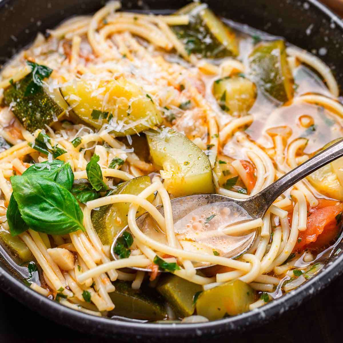 Italian zucchini soup with diced zucchini, broken spaghetti, hand-crushed canned tomatoes, fresh basil, and parsley, topped with plenty of Pecorino Romano cheese.
