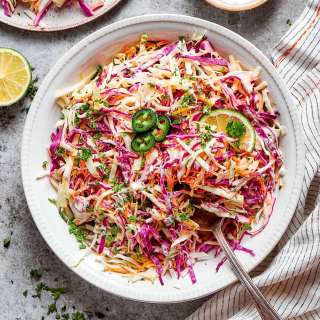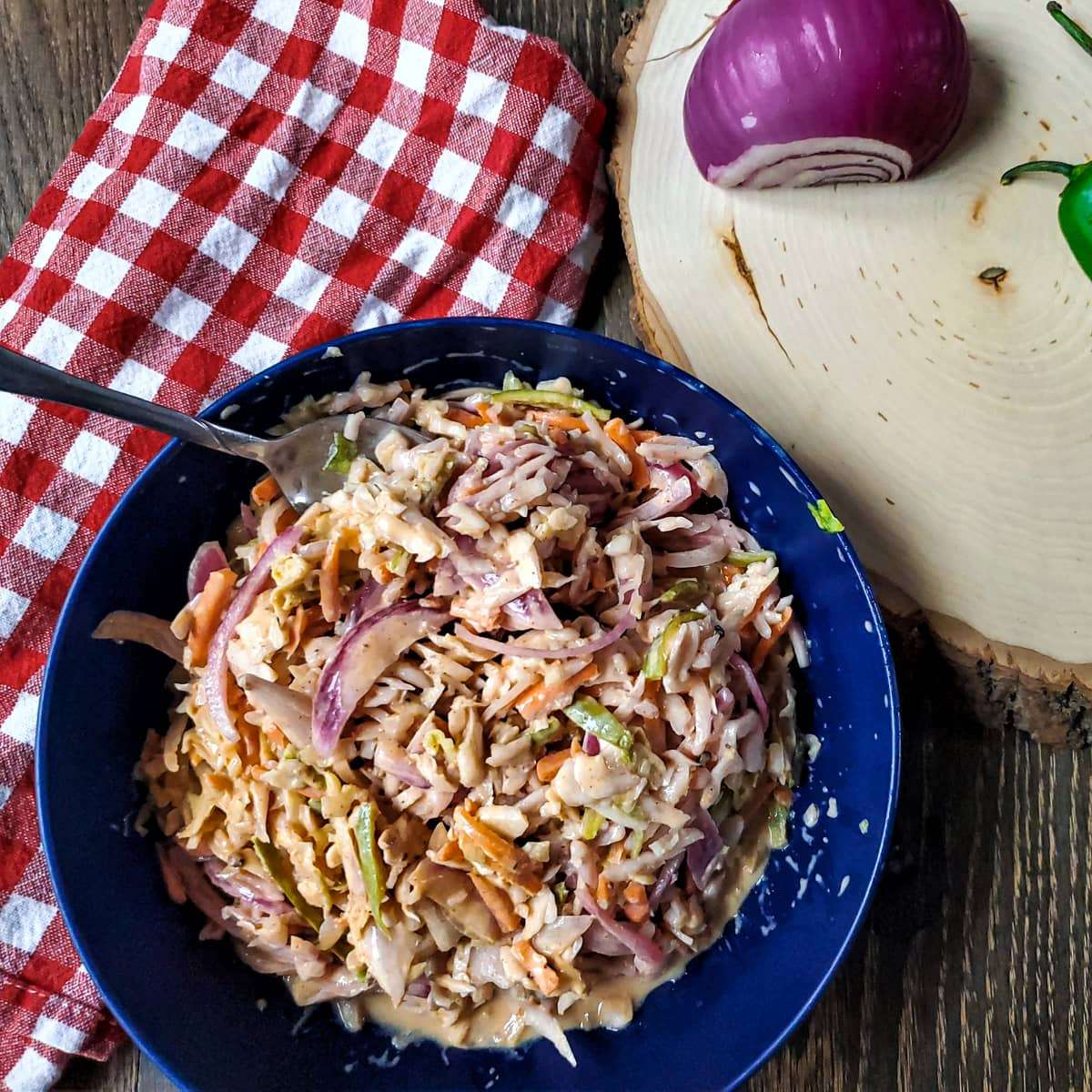 - In a medium bowl, toss the coleslaw mix with the sliced jalapenos and sliced red onion.