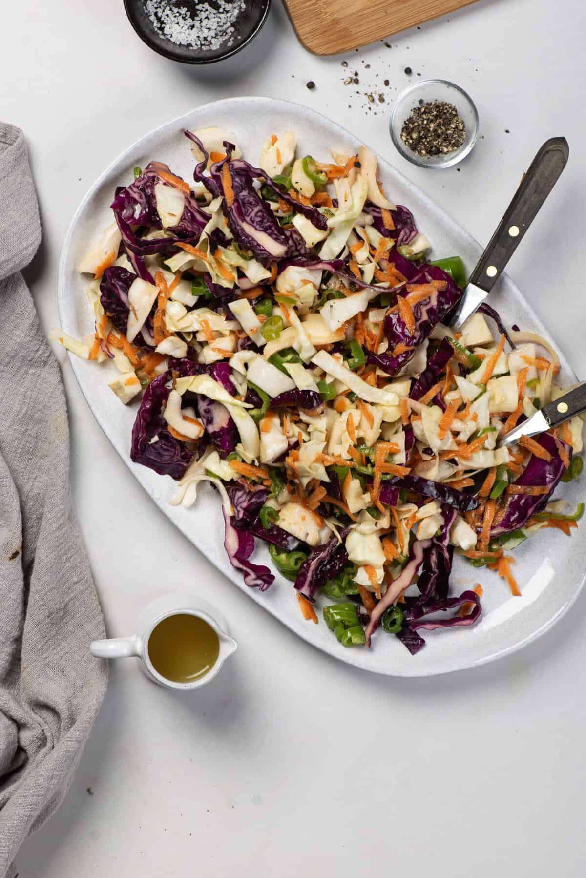 - In a large bowl, combine green cabbage, red cabbage, carrots, red onion, and jalapeños.