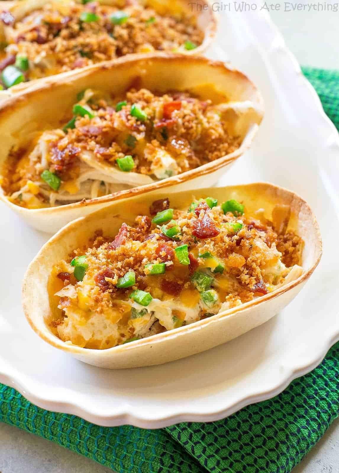 - To assemble the tacos: Divide chicken mixture evenly between the 8 taco boats. Divide the remaining 1 cup of shredded cheese on top of each boat. Top with the bacon crumbles, Panko crumbs, and additional diced jalapeno (if desired).