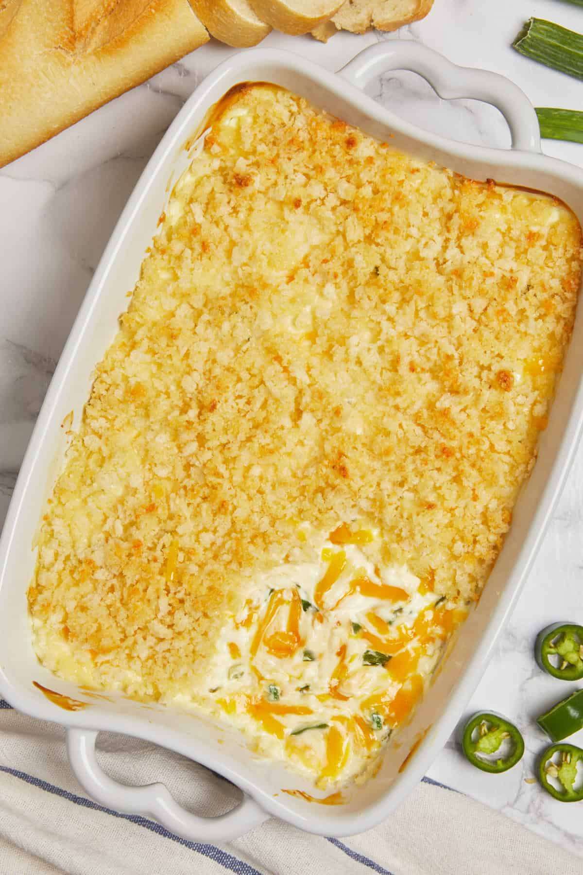 - Bake in the preheated oven for 20 minutes or until the topping is golden brown and the dip is bubbling. Serve warm with chips or crackers.