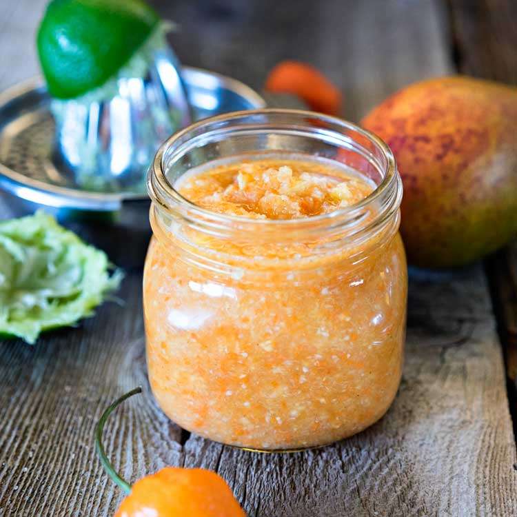 This Jamaican Pepper Sauce brings the heat with habaneros, mango, pineapple and cumin, but the secret flavor weapon ingredient I like to add is a carrot.