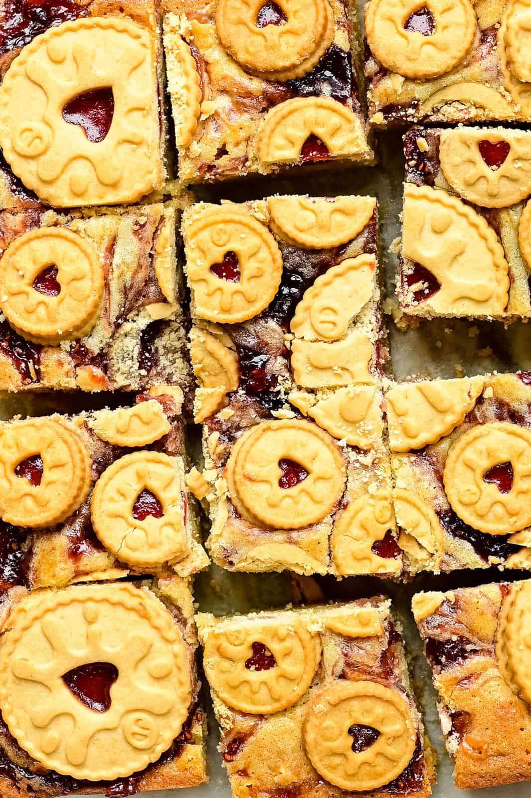 Delicious Jammie Dodger Blondies – gooey white chocolate blondies swirled with raspberry jam and topped with Jammie Dodger biscuits! So easy to make and absolutely irresistible!