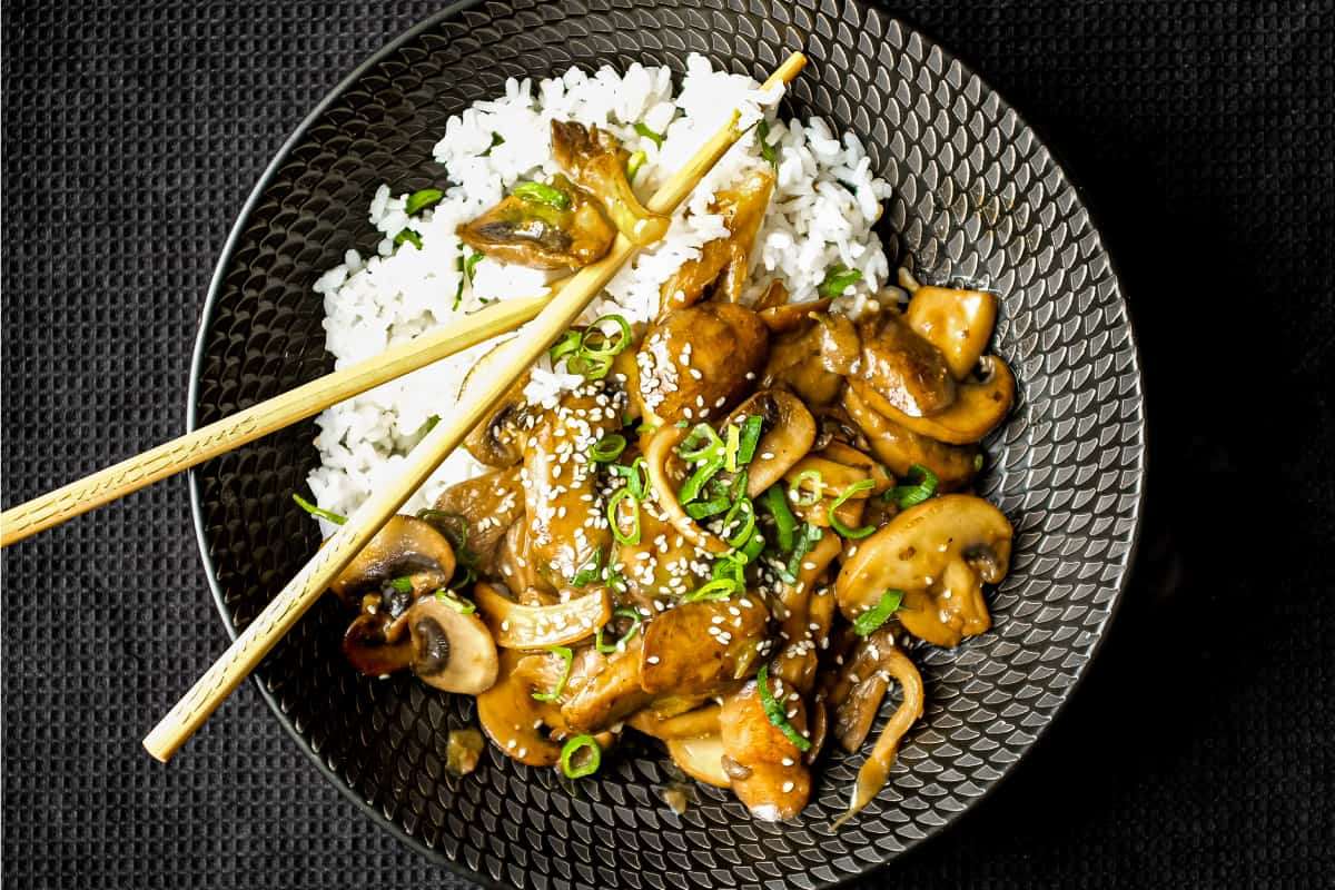 - Top some freshly cooked rice with some mushrooms and garnish with the green parts of the spring onion (finely sliced) and some sesame seeds.