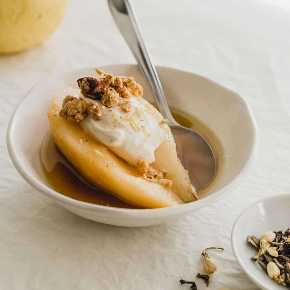 This recipe for Jasmine Tea Poached Pears features tender pears infused in a fragrant and aromatic jasmine green tea, making it a light and refreshing dessert.