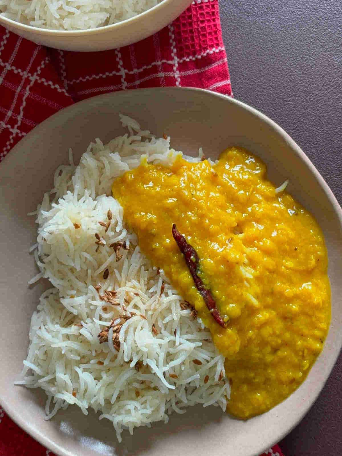Toor Daal with Bay Leaf and crisp Cilantro (Pigeon Pea soup) with Jeera Rice