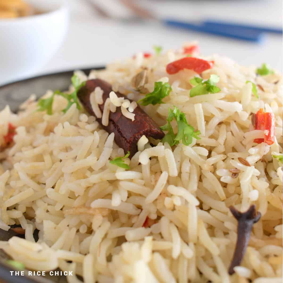 - Fluff the rice with a fork or spoon. Remove spices. Garnish with chopped coriander leaves or parsley if desired and serve.