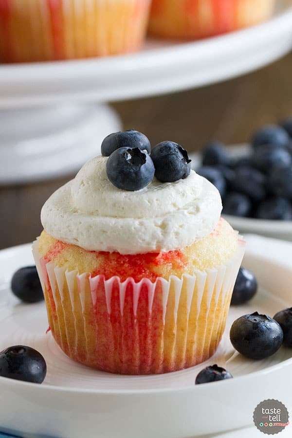 Cupcakes go patriotic with these cupcakes that are streaked with red, then topped with white and blue. You can easily change the jello flavor and the topping for different holidays or flavors.