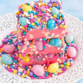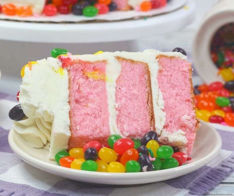 This easy to make Jelly Bean Cake offers a fun surprise in the center. This pinata style cake is a moist vanilla cake that is filled with jelly beans. Topped with jelly beans, kids are going to be amazed when they see you cut this cake open.