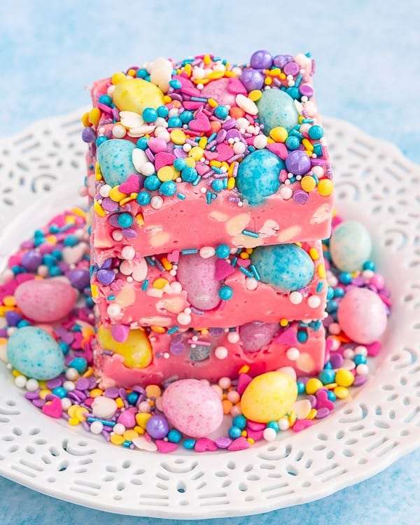 Delicious and easy vanilla fudge are dressed up for Easter with sprinkles and jelly beans. This fudge can be made in minutes!