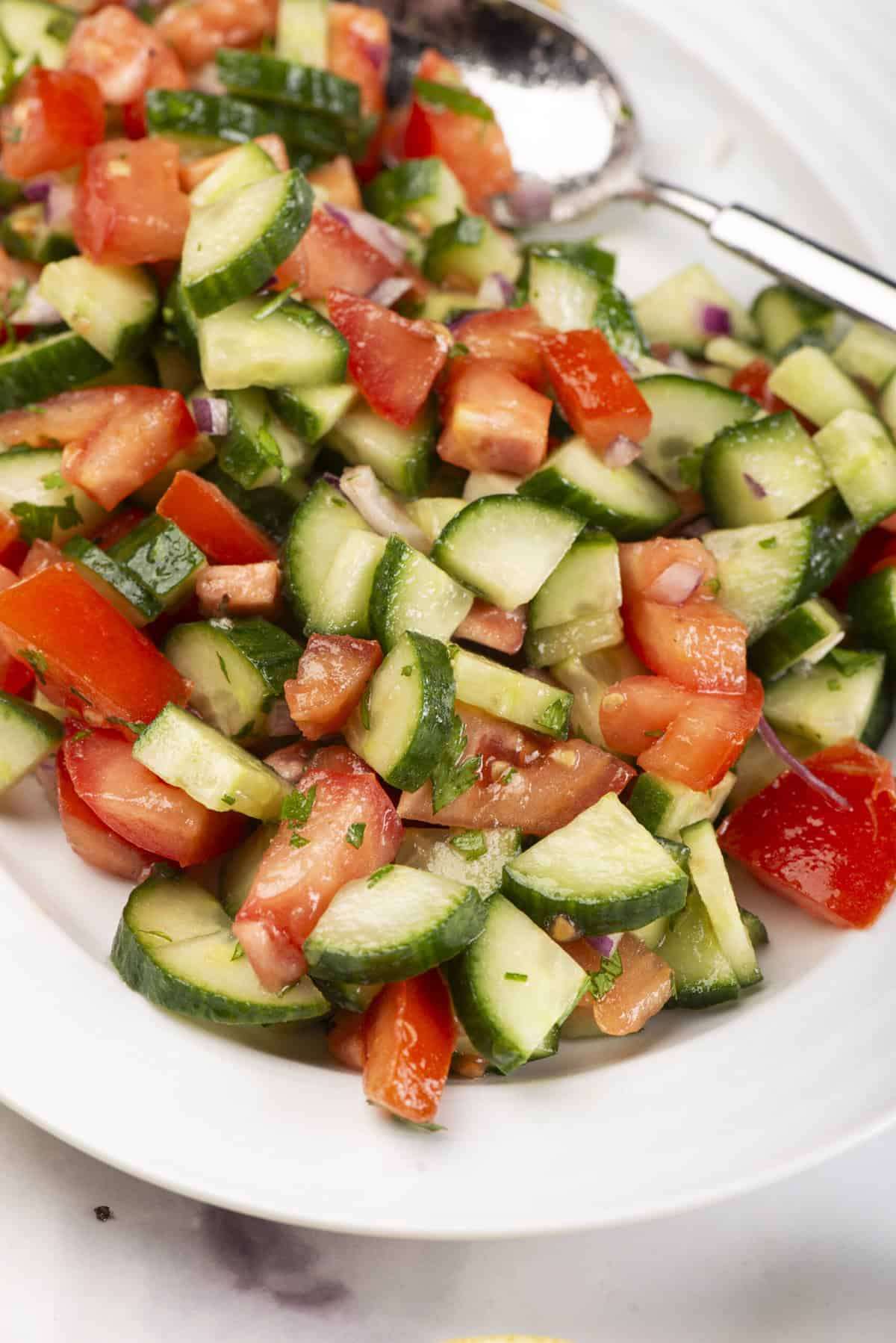 - In a large bowl, combine the chopped cucumbers, tomatoes, red onion, and parsley. Drizzle with olive oil and lemon juice.