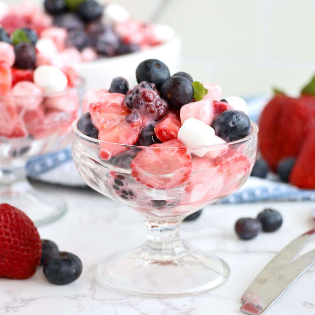 This healthy patriotic fruit salad is full of sweet berries, marshmallows, and yogurt for the creamy base instead of whipped topping. Perfect July 4 fruit salad!