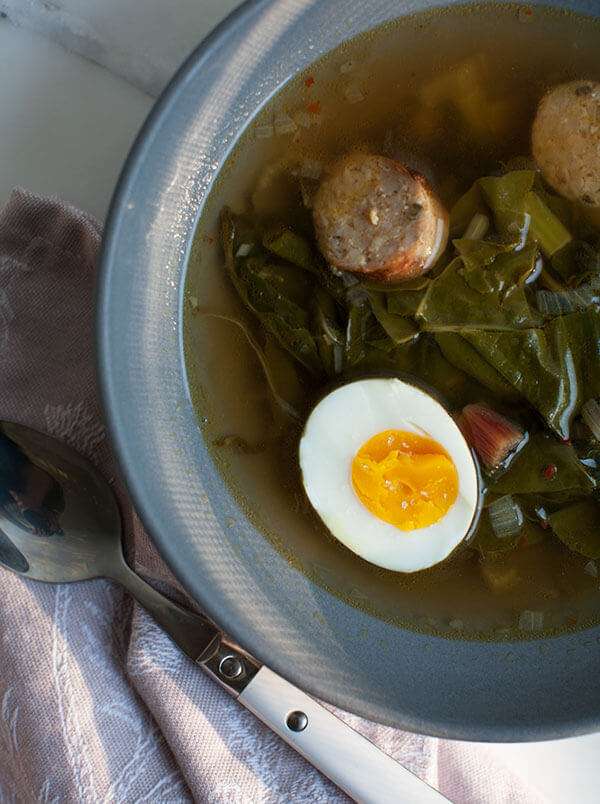 - While the pot likker is cooking, sauté the sausage and slice (if using). Stir in the sausage and divide the soup between bowls. If adding an egg, place an egg into each bowl. Serve immediately. Soup will keep in an airtight container in the fridge for 4-5 days. Bonus: This soup heats up really well. It’s a good one to make at the beginning of the week and eat throughout.