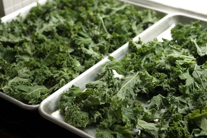 - Spread the kale leaves in an even layer on the baking sheet and put in the oven. After about 5 minutes, use a spatula to separate any leaves of kale that are clumping together.
