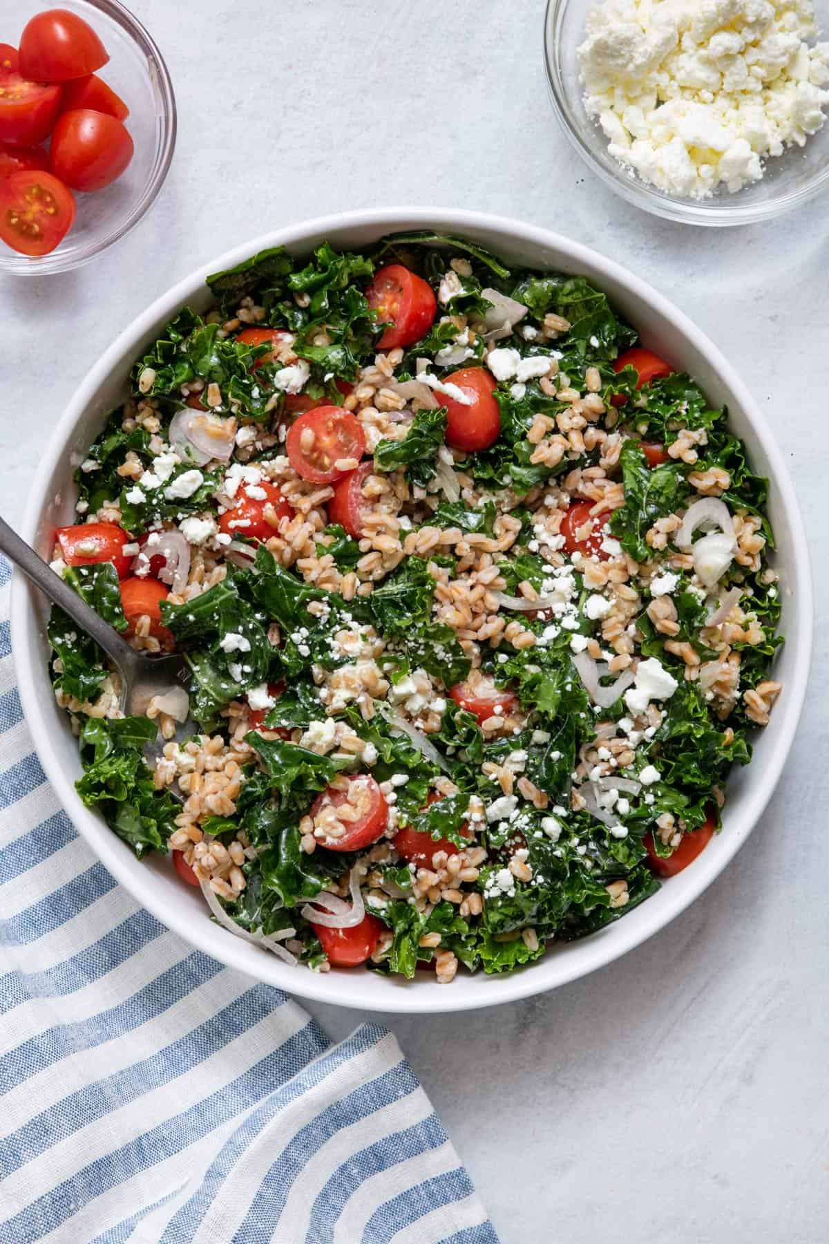 - Add the farro on top of the kale along with the halved tomatoes, crumbled goat cheese and sliced shallots. Toss gently to combine and serve immediately or refrigerate for a colder salad.