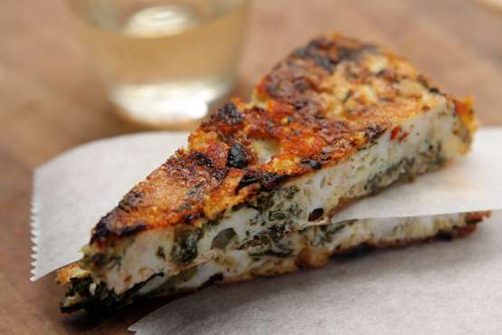 - Use a spoon to coax the eggs around the kale and sausage so that it’s evenly dispersed. Cook over medium heat for 5 to 6 minutes, then run a spatula around the edges to loosen it from the pan. (At the same time, if you can lift a little of the bottom while the frittata is cooking, it’s a good idea to make sure that it’s browning, but not burning. After loosening the sides, wearing oven mitts, invert a large dinner plate over the top of the skillet and flip both the pan and the plate over simultaneously being careful of the hot skillet. Then slide the frittata, cooked-side up, back into the pan and cook for another minute or so. (Alternatively, instead of flipping the frittata, you can run it under the broiler or put it in a very hot oven, until the top is cooked.)