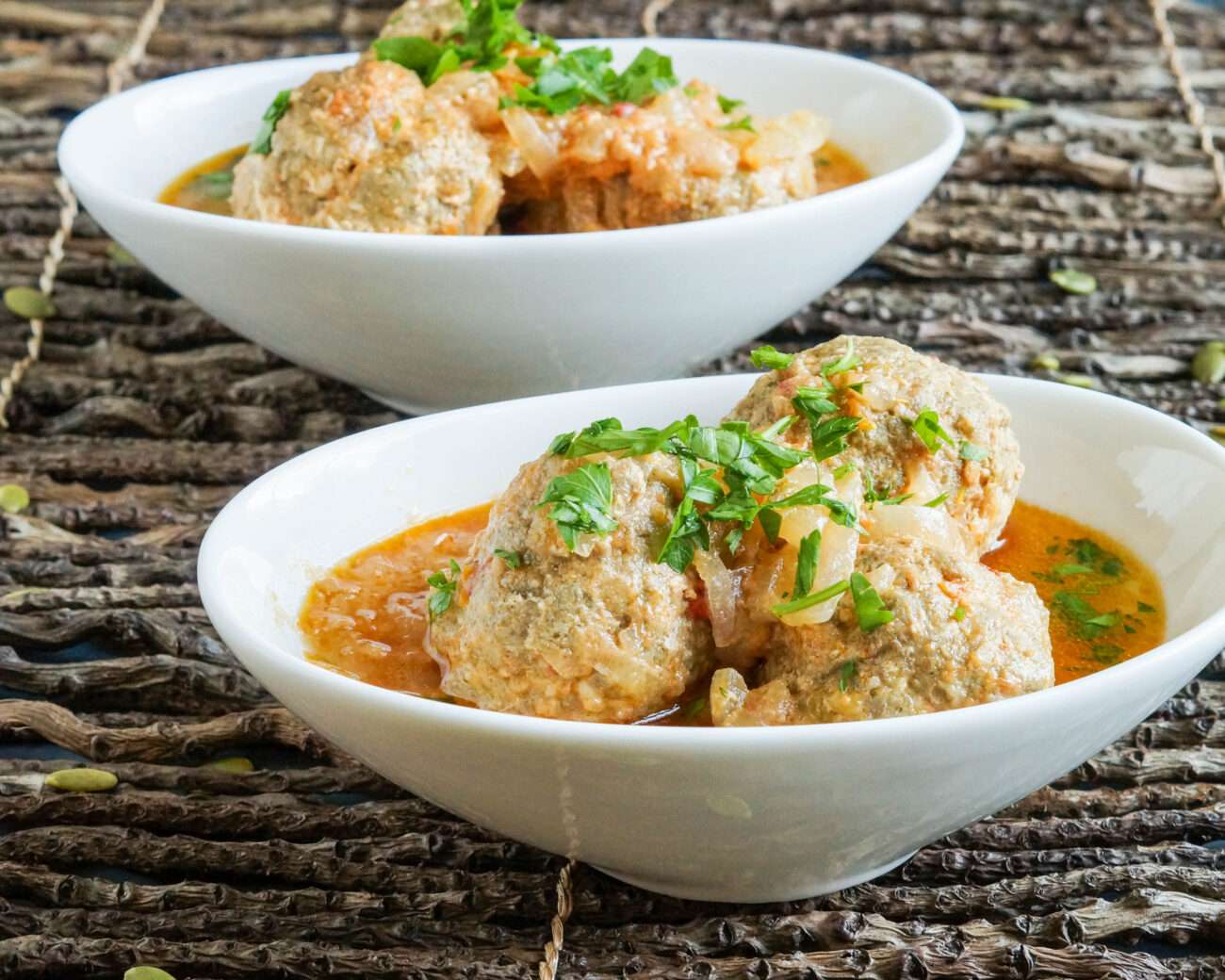A recipe for Kanda (Central African Pumpkin Seed Meatballs)! These savory meatballs are simmered in a spiced tomato sauce, topped with parsley, and served with steamed rice.
