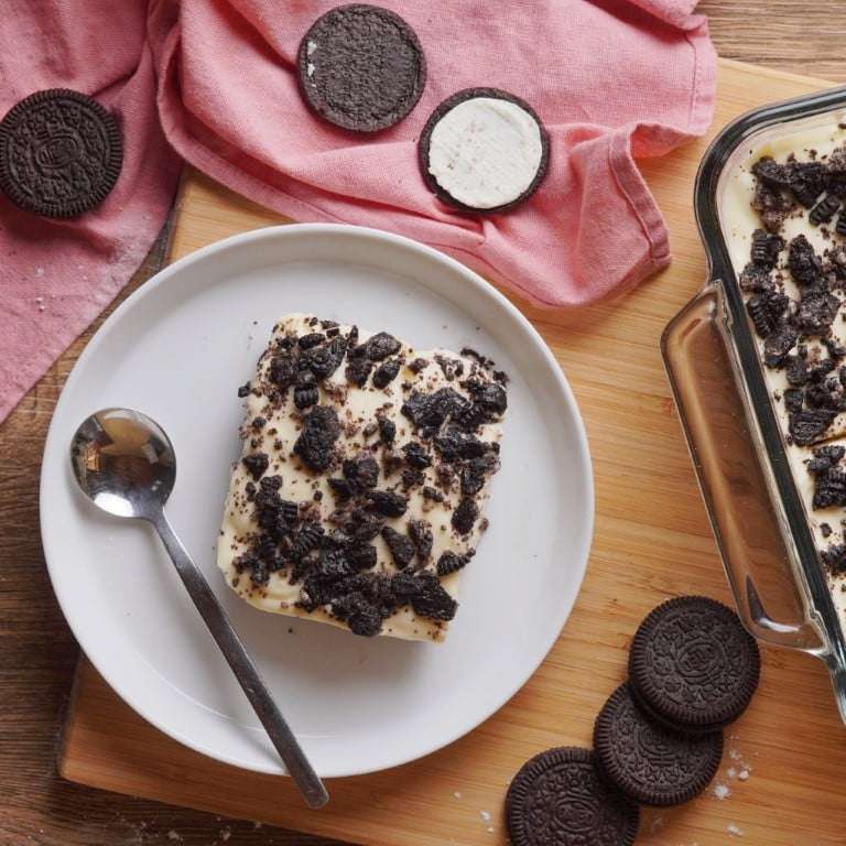 - Place Oreos in a gallon-size plastic bag and crush with a rolling pin or a meat mallet. Fill the bottom of a 9 x 13 baking dish with 2/3 of the Oreo crumbs. Set this aside.