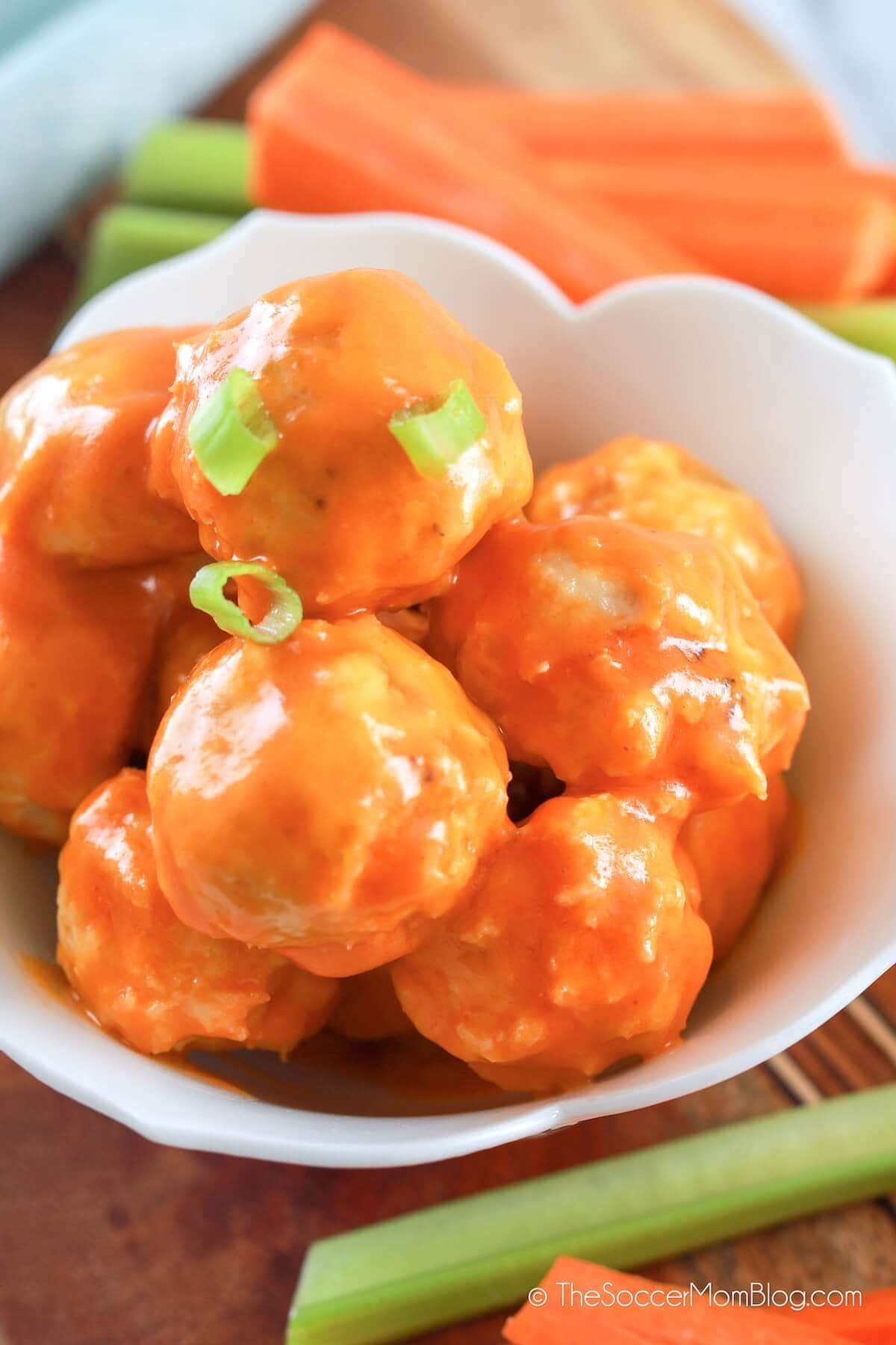 - When meatballs are done baking, allow to cool slightly (just enough to handle) and gently toss in the buffalo sauce.
