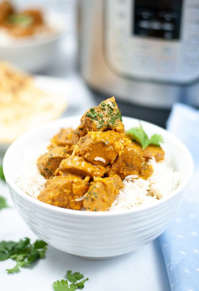 Instant Pot recipe with diced chicken in a rich butter sauce with cream, tomato sauce and spices common in Indian cooking.