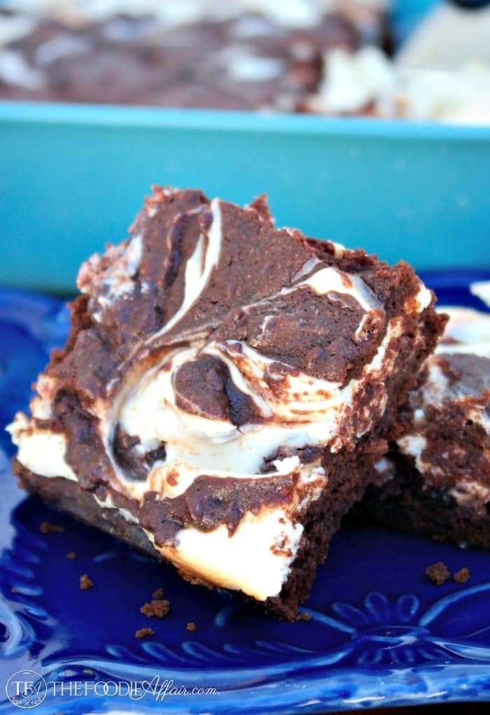 - Bake for 35 minutes or until filling is set and a toothpick comes out clean when inserted in the brownies. Cool. and refrigerate before cutting.