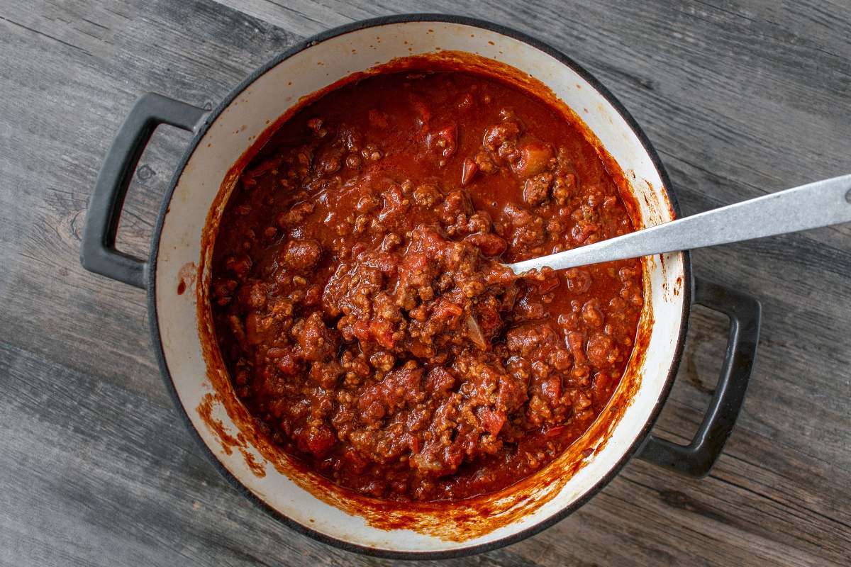 - Pour in tomatoes and bring to a simmer. Lower the heat and cook for 15 more minutes, stirring occasionally.