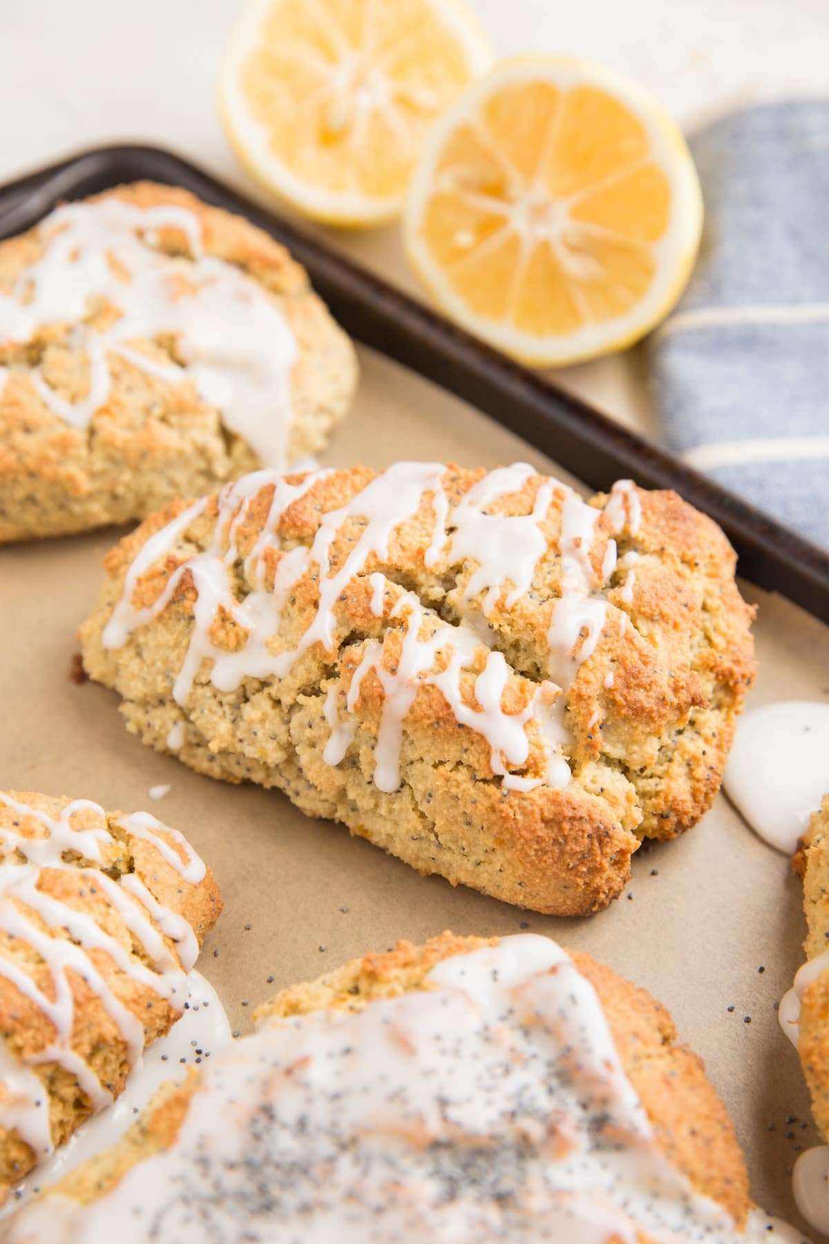 Amazing low-carb keto scone recipe with lemon and poppy seeds with a delicious simple lemon glaze are perfect for sharing for breakfast, brunch, or dessert!