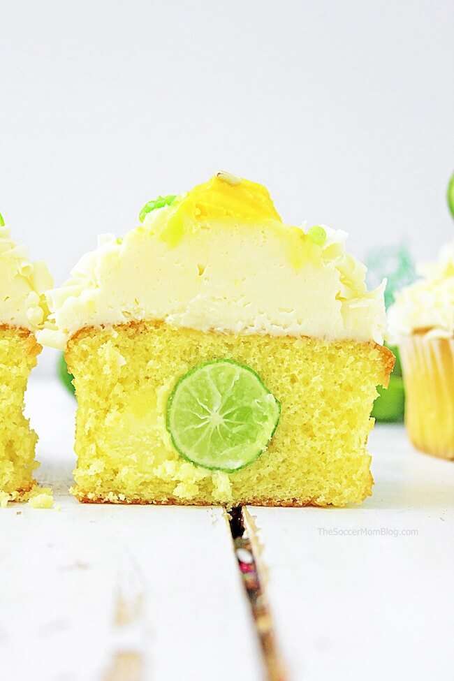 - Slice a key lime into extra thin slice and place a slice in the middle of each cupcake. Fill the rest of the middle with key lime filling that you made.