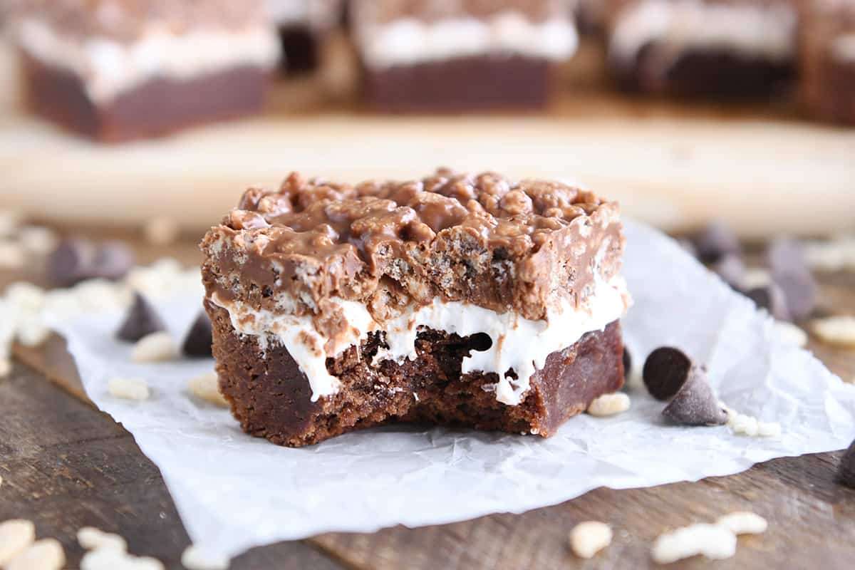 - Scoop spoonfuls of the crispy topping over the marshmallow layer and gently spread into an even layer. Let the pan of brownies cool to room temperature and then refrigerate until the chocolate krispie topping is set, 1-2 hours. Serve chilled or at room temp.