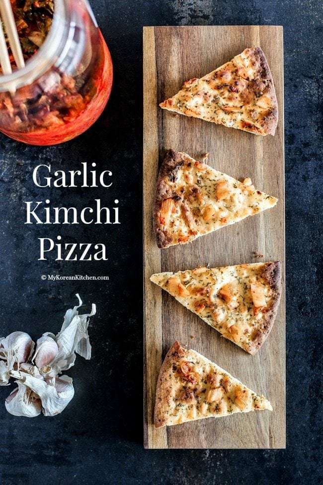 - While waiting, prepare the pizza. Brush the base oil on the pizza base and sparingly place the chopped Kimchi.