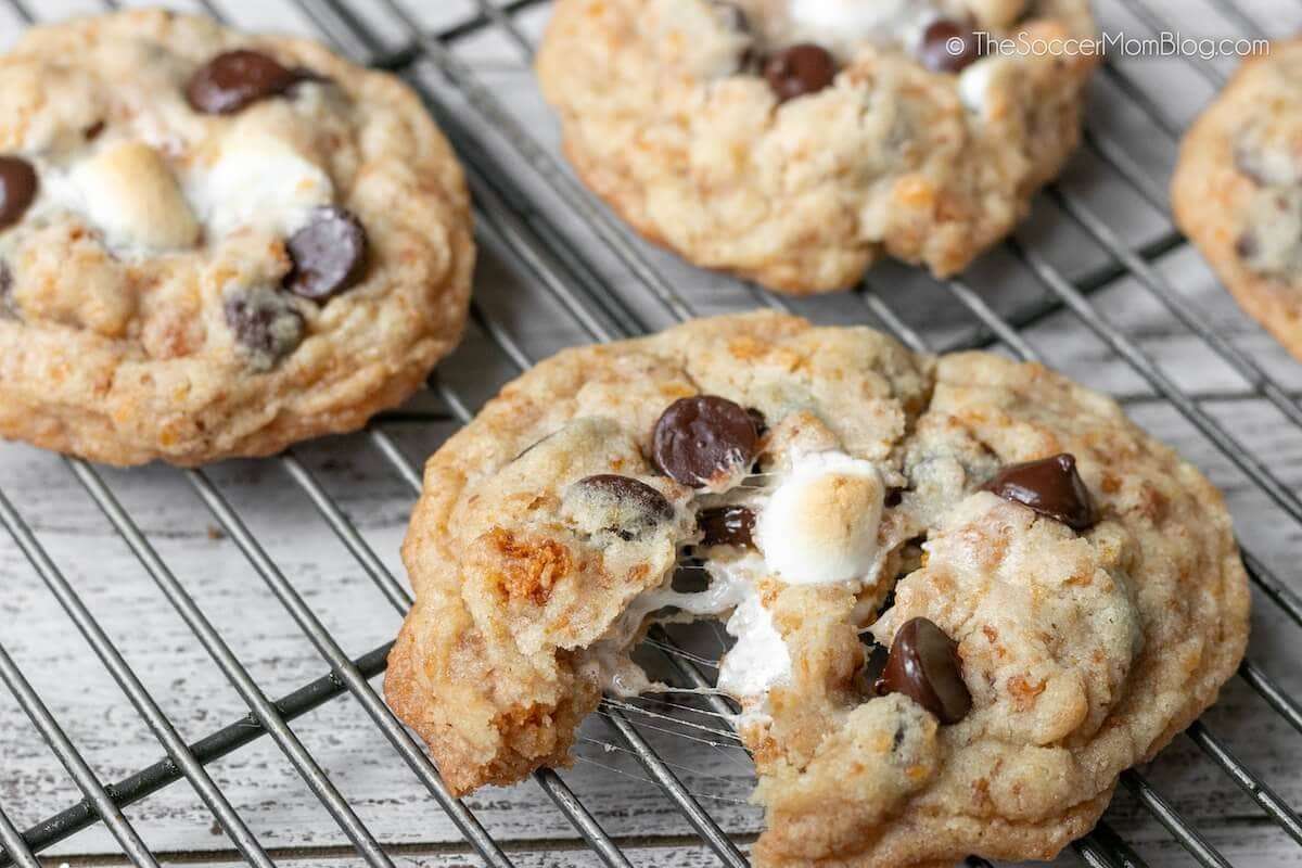 - Take about 1/4 cup batter in hand and flatten slightly. Add 2-3 marshmallows to the middle, then form the dough into balls around the marshmallows.