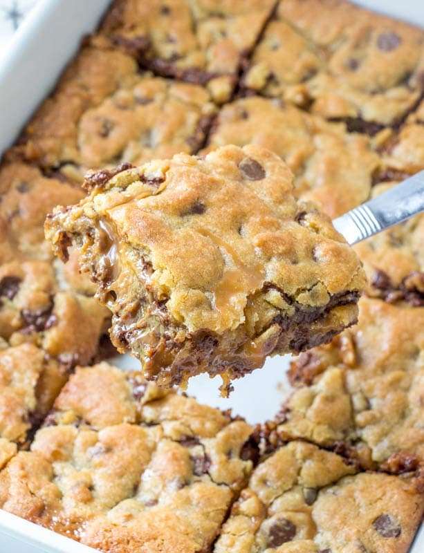 Delicious Caramel Cookie Bars with an amazing layer of gooey caramel stuffed in better the layers with a hint of peanut butter. These cookie bars are EPIC and you'll never make them anyway again!