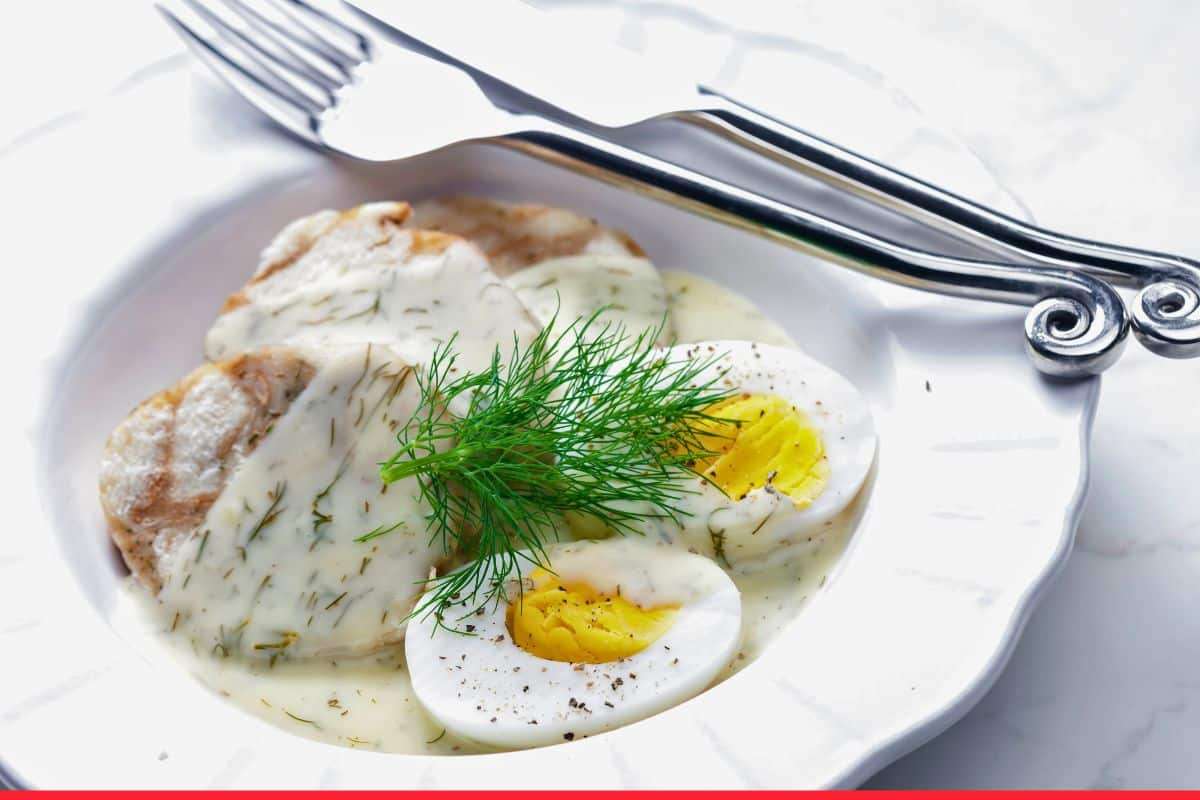 - Take the sauce off the heat and add in the sugar and heavy cream until homogenous then stir in the vinegar and chopped dill as well.