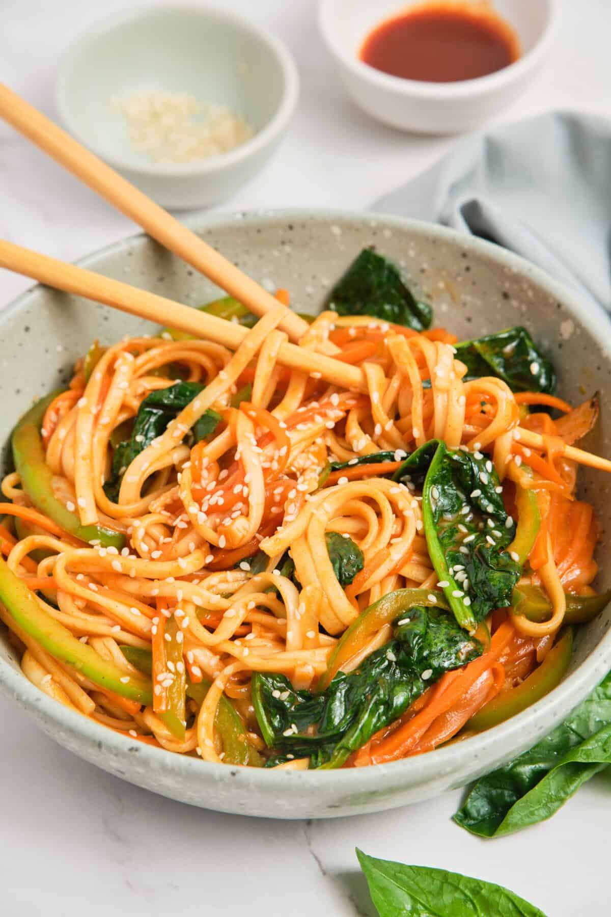- Add noodles and spinach to the skillet. Toss everything together and cook until the spinach is wilted and the noodles are heated through.