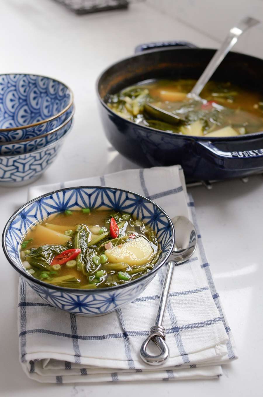 Korean turnip green and potato soup makes is homey and comforting. Korean soybean paste deepens the flavor of broth and makes it delicious to serve with rice.