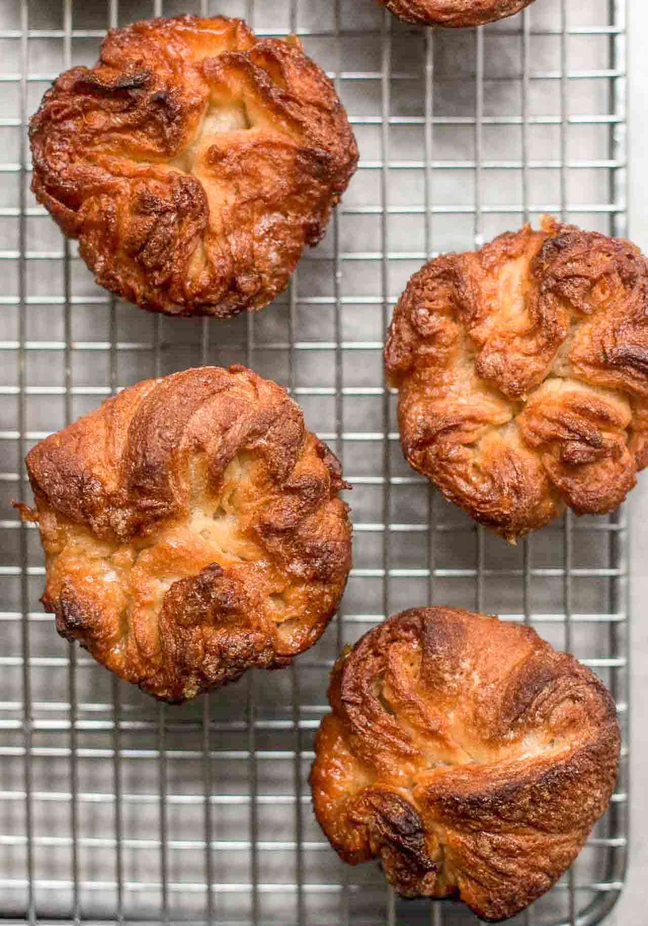 - Bake for 40-45 minutes, until the top is deeply caramelized. Let stand a few minutes, then run a spatula around the edges to release the Kouign Amann and slide the cake from the pan onto a cooling rack.