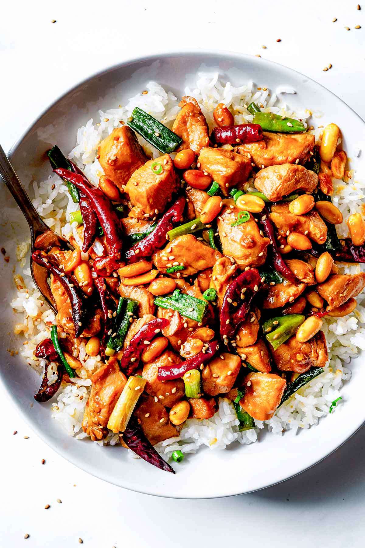 A delectably spicy, sweet, and savory Asian-inspired sauce clings to every piece of juicy chicken in this easy dish. Kung pao chicken is quicker to make at home than ordering takeout, and it tastes so much better too.