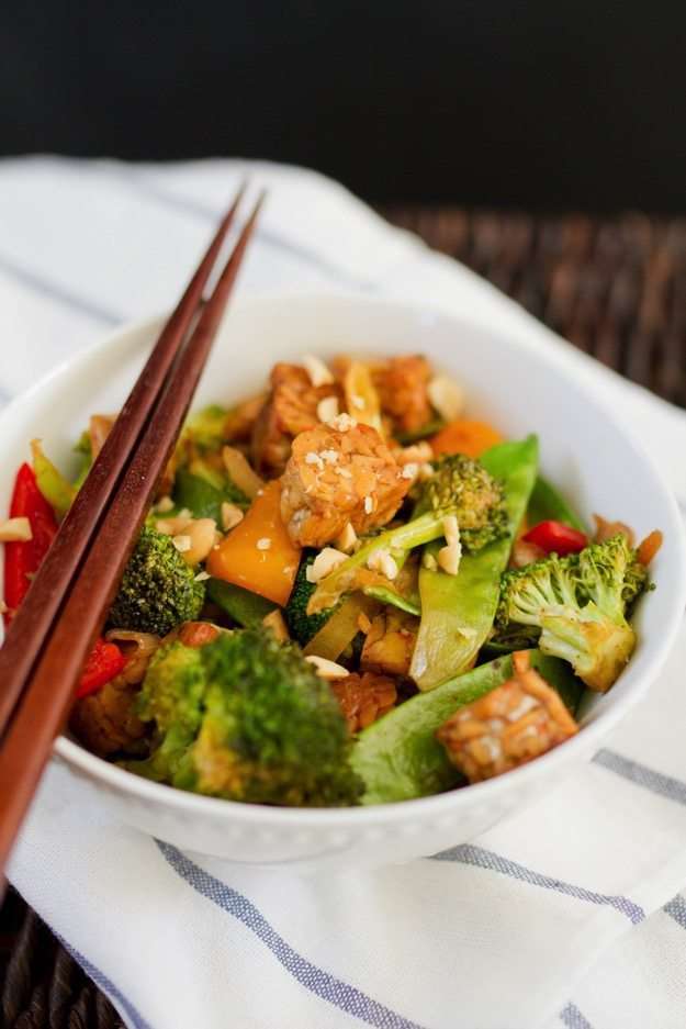 - Return the tempeh to the skillet along with snow peas and stir to coat with sauce. Serve tempeh and veggies over warm rice with crushed peanuts on top.