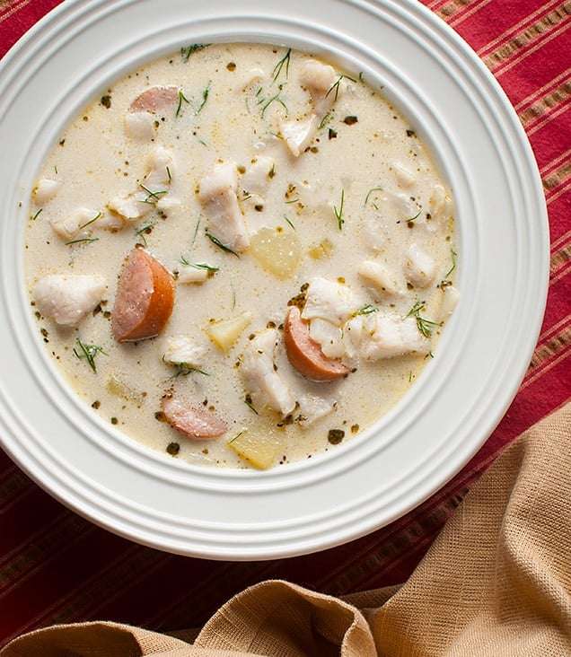 This is a pretty standard fish chowder with some Polish flair tossed in. I of course used Lake Erie yellow perch, but any firm fish will do. Use a good chowder fish like perch, tautog, tilefish, sturgeon, cobia, California white seabass, grouper -- the key is firm and white. Most good Polish kielbasa sausage is smoked, and while you can use whatever sausage you want, make sure it is smoked. You want that flavor with the mild fish. The dill really adds something to the stew, but if you hate it, use parsley instead. As for the sour cream, put it in a bowl at the table and let people add it to their liking.