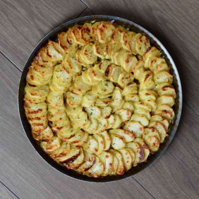 - Garnish with sliced potatoes. Start from the outside and lay the potatoes, heading towards the center.