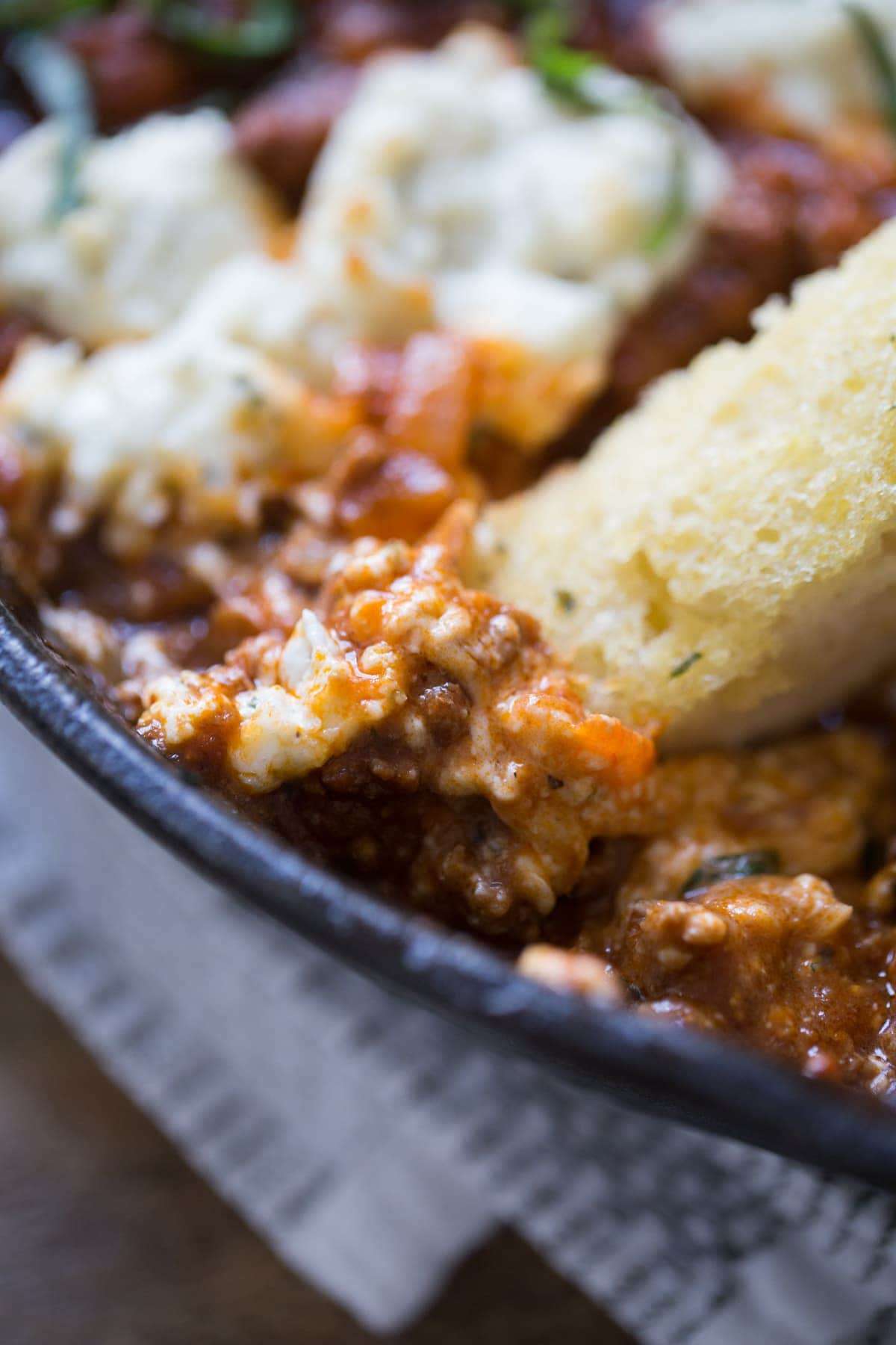 Hot, cheesy, meaty, savory and delicious, this Cheesy Lasagna Dip will easily become a crowd favorite. Serve with garlic bread for ultimate flavor!
