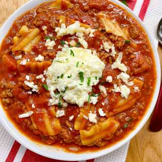This baked Lasagna Dip features a zesty tomato sauce with Italian sausage and melty pockets of cheese, all ready for scooping with garlic bread dippers!