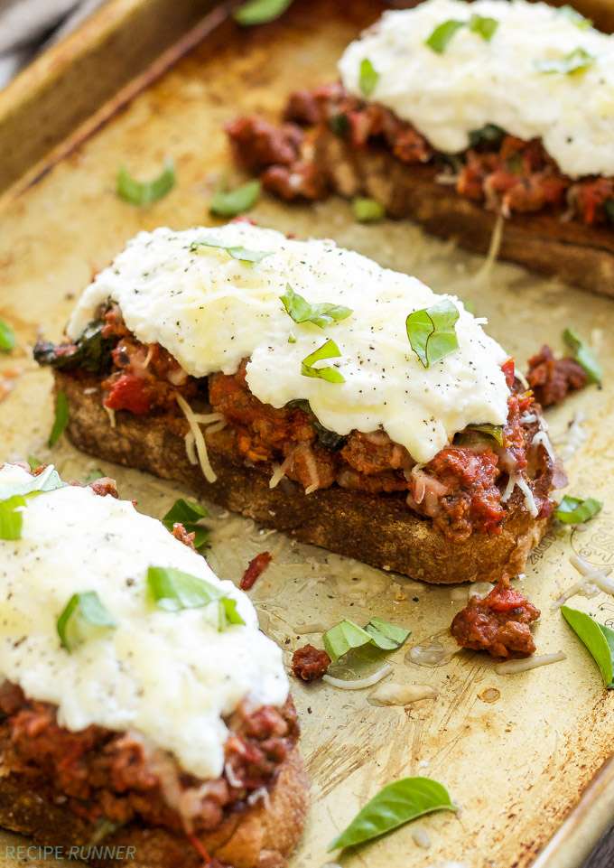 - Spoon some of the meat sauce onto the tops of each piece of bread and top with the ricotta and mozzarella cheese.