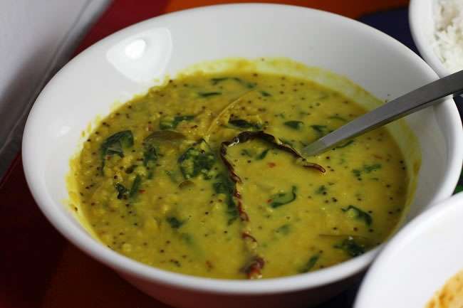 - Add some oil, the diced onions, chilli pieces, the last curry leaf sprig, and mustard seeds. The pan is hot and the seeds will sizzle and spit. After the onions are nicely browned (not burnt) turn the stove off and then add the cooked Dahl, and the spinach and heat gently.